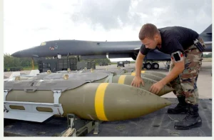 File photo showing US Air Force weapons loaders preparing a 2,000-pound bomb for loading into a B-1 bomber during the US invasion of Afghanistan in 2001. (AFP)